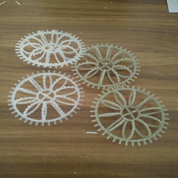 其(qí)結(jié)構是將塑料圓片壓扣改成雙圈大塑料環,將醛化纖維或滌綸絲(sī)壓在環的環圈(quān)上,使纖維束均勻分布;內圈是雪花狀塑料枝條,既能掛膜,又能有效切割(gē)氣泡,提高氧的轉移速率和利用率(lǜ)。使水氣生物膜得到充分交換,使水中的有機(jī)物得到高效處理。