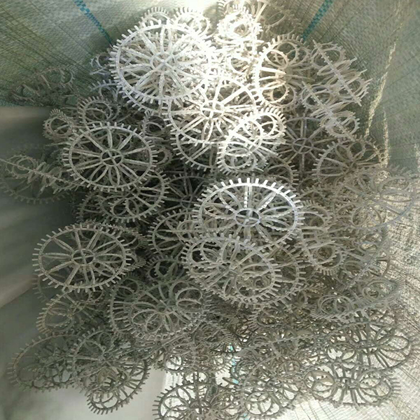 pp生物填料是在(zài)軟性填料和半軟性填(tián)料的基礎上(shàng)發展而成的,它兼有(yǒu)兩者的優點。其結構是將塑料圓片壓扣改成雙圈大塑料(liào)環,將醛化纖維或滌綸絲壓在環(huán)的環(huán)圈上,使(shǐ)纖維束均勻分布;內圈是雪花狀(zhuàng)塑料枝條,既(jì)能掛膜,又能有效切割氣泡,提高氧的轉移(yí)速率和利用率。使水氣生物膜得到充分(fèn)交換,使水中的有機物得到高效處理。pp填料是以PP為(wéi)主要原料製作的一種生物填(tián)料(liào),具有生(shēng)物親和性,如有做改性(xìng)處理,易掛膜。常常加工成階梯環形填料,用於汙水處理或者工廠化養殖的MBBR環節中。